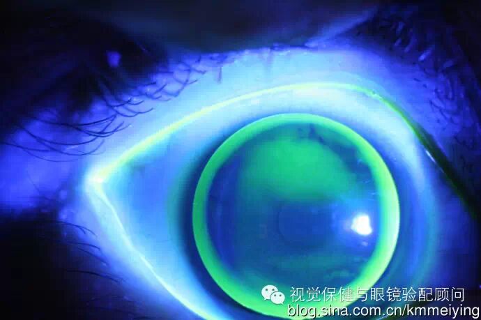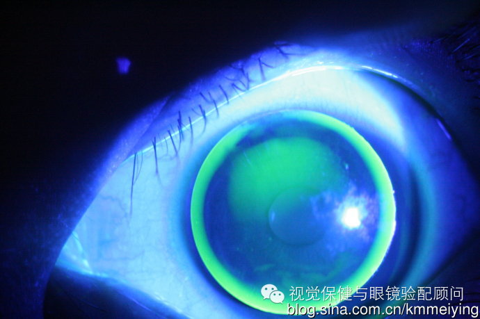 双眼荧光评估图显示:中央平行配适,边翘大,镜片部分边缘泪液填充不完全,边翘宽度约0.9~1.0mm。双眼视力矫正都好,但镜片反复掉出。家长对镜片提出质疑,最后放弃RGP要求退货!